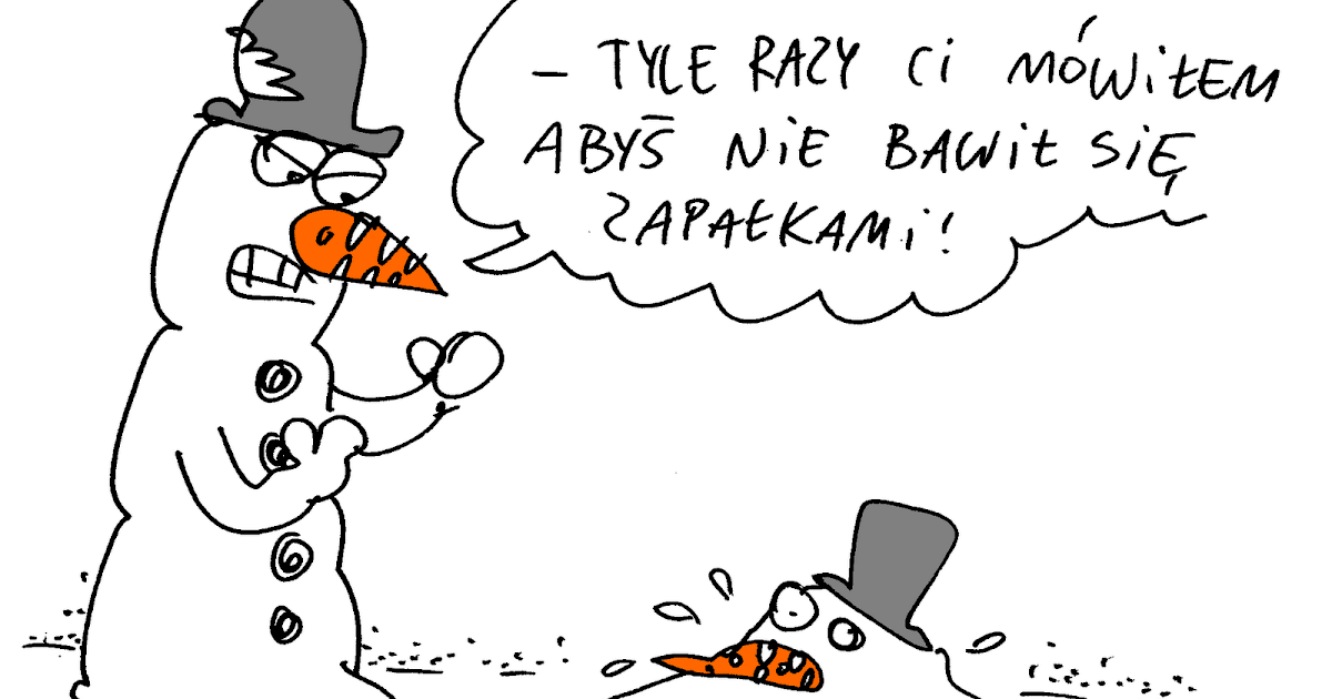 PS. A! Jeszcze jedno. Oczywiście po marchewce, węgielkach, kapeluszu i miotle nie zostanie ani śladu. W dziwny sposób znikną, zabrane przez sójki za morze. A nam zostanie tylko nieładna kałuża. I złamana na niej noga gdy przyjdzie mróz.